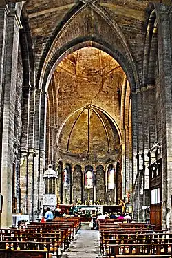Das Schiff reicht von der Westwand bis zur Vierung und ist in drei gleich breite Joche unterteilt. Die Teilungen übernehmen angespitzte scharfkantige Gurtbögen, die auf Vorlagen gleichen Querschnitts stehen, die schiffseitig mittig vor mächtigen vierfach gestuften Pfeilern stehen. Die Bogenansätze der Vorlagen und Abstufungen werden durch Kämpferprofile markiert. An den Pfeilern zwischen Joch 3 und der Vierung gibt es in gut halber Höhe ebensolche Kämpferprofile. Die Joche werden überdeckt von Kreuzrippengewölben, deren kantige Rippen auf den inneren Rückversätzen der vorgenannten Pfeiler stehen. Die angespitzten Schildbögen der Wände bestehen aus doppelten Rückversätzen, die auf den äußeren beiden Rückversätzen der Pfeiler stehen. In den Schildbögen der Südwand ist jeweils ein schlankes rundbogige Fenster mittig ausgespart. Auf der Nordseite gibt es keine Fenster. Im ersten Joch ist über die gesamte Grundfläche des Jochs eine Emporendecke gespannt, die unterseitig diagonale Gratbögen aufweist. Auf der Ostkante der Decke ist in ganzer Breite ein flacher Rundbogen gespannt, der über der Decke eine flache Schwelle besitzt, auf der ein Schutzzaun aus Metall errichtet ist. Die Empore trägt keine Orgel. Sie wird erschlossen über eine Treppe im südwestlichen Pfeiler. In der Westwand über der Empore ist die von außen bekannte Dreiergruppe der Fenster ausgespart, aus einem Ochsenauge und zwei schlanken rundbogigen Fenstern, alle mit aufgeweiteten Gewänden. Unterhalb der Emporendecke ist genau mittig das rechteckige Westportal ausgespart. Im dritten Joch ist mittig in der Südwand das rechteckige Südportal ausgespart, das als Hauptportal genutzt wird.