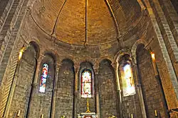 Das Chorhaupt besteht aus der im Grundriss halbkreisförmigen Chorapsis in der Ostwand der Vierung. Der Triumphbogen besteht seitlich aus den äußeren Rückversätzen der dreistufigen Pfeiler der Vierung. Seine Bogenansätze werden von Kämpferprofilen markiert. Darüber steht der scharfkantige angespitzte Keilsteinbogen, oberflächenbündig mit der Vierungswand. Auf Höhe der vorgenannten Kämpfer verläuft ein schlankes Kragprofil waagerecht rund um die Apsis, das feingliedrig dekoriert ist, das auch die Gewölbeansätze der Kuppelkalotte markiert. Hinweisen muss man darauf, dass die außen polygonale Apsis und ihre Wölbung innen sauber gerundet ist. Unter dem Gewölbeansatz verläuft ein breiter Streifen eines Zackenprofils, das bereits vom Äußeren der Apsis unterhalb des Traufgesimses bekannt ist. Unter diesem Streifen verläuft ein breiterer Streifen des Wandmauerwerks der Apsisrundung. Dieser wird getragen von einer Reihung von sieben kleinen schwach profilierten Blendbögen. Ihre Bogenansätze stehen vor der Außenwand auf glatten schlanken Säulen, die mit floral skulptierten Kapitellen, profilierten Kämpfern und Basen auf kantigen Plinteh ausgerüstet sind. Auf halber Höhe der Säulen finden sich schlicht profilierte Kapitelle. Die Säulenbasen stehen auf einem um die Apsis rund herumlaufenden knapp zwei Meter hohen Sockel. In den Hintergründen der sieben Zwischenräume erscheint das Mauerwerk hinter den Säulen wieder polygonal abgeknickt zu sein. In drei Wandabschnitten sind in der oberen Hälfte schlanke rundbogige Fenster ausgespart, deren Gewände aufgeweitet sind.