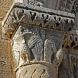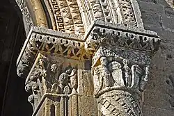 Die Archivolte des Portals wird zunächst oberflächenbündig mit der Fassade flankiert von einem gut einen halben Meter breiten Wandstreifen der mit unterschiedlich langen senkrechten Kanneluren verziert ist. Diese stehen auf Sockeln in Höhe derjenigen unter den seitlichen Säulen und enden auf Oberkante Kämpfer. Unmittelbar neben ihnen stehen halbrunde Säulen, mit deutlich größer dimensionierten Durchmessern. Sie reichen vom Bodenniveau mit ihren Kämpfern bis deutlich über den Bogenscheitel der Archivolte. Sie sind mit skulptierten Kapitellen, profilierten Kämpfern und Basen auf Plinthen ausgestattet. Das linke Kapitell zeigt pflanzlichen Dekor, das rechte figuralen Dekor mit Adlern, die ihre Flügel ausgebreitet halten. Die Säulenschäfte sind mit kräftigen Kanneluren dekoriert. Bei der linken Säule drehen diese sich in den oberen zwei Drittel spiralförmig um den Schaft, darunter kreuzen sie sich untereinander. Bei der rechten Säule verlaufen die Kanneluren zick-zack-förmig um den Schaft. Die Kämpferprofile der Säulen sind untereinander mit einem fast gleichen Gesimsprofil verbunden. Auf den Säulenkämpfern steht ein Gebilde in Form von Ortgängen eines Satteldachs, mit knapp über 30 Grad Neigung. Die Formgebung der sich in kurzen Abständen wiederholenden tiefgründigen Motive ist kompliziert, etwa vergleichbar den Hobelspankragsteinen. Kurze Rollenprofilstücke werden von gleich breiten Pflanzenfächern unterstützt und auf Abstand gehalten und das in zwei Reihen. Jede dieser Reihen wird begleitet von einem schmalen Band mit rechteckigen Vertiefungen und dreieckigem Querschnitt. Außenseitig sind die „Ortgänge“ plan abgeschlossen.