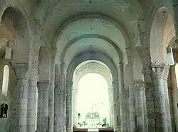Das Mittelschiff des Langhauses ist mit einer Längstonne gedeckt, die von Gurtbögen gegliedert wird. Die Kreuzgratgewölbe der beiden Seitenschiffe liegen insgesamt unterhalb des Tonnengewölbes, so dass sich eine Pseudobasilika ergibt. Die Arkaden zwischen den Schiffen werden von frühen Bündelpfeilern aus hellem Kalkstein getragen.