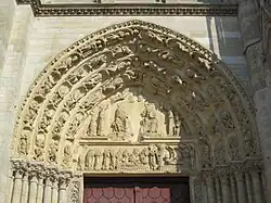 Der Haupteingang der Stiftskirche, ist Maria und ihrer Aufnahme in den Himmel geweiht[11]. Das Marienportal gilt als ein Meisterwerk der westlichen Bildhauerei. Es besteht aus zwei Teilen, die im Abstand von zehn bis fünfzehn Jahren entworfen wurden. Der untere Teil, unterhalb der Sturzbasis, muss sehr kurz nach dem Auferstehungsportal ausgeführt worden sein. Der gesamte obere Teil (Gewölbe und Tympanon) ist wesentlich später entstanden. Es ähnelt dem der Jungfrau Maria gewidmeten Portal der Kathedrale von Senlis. Bei der Restaurierung des Portals im Jahr 1998 wurden Fragmente der Polychromie freigelegt. Die Farben Rot, Grün und Blau herrschen in der Komposition vor.