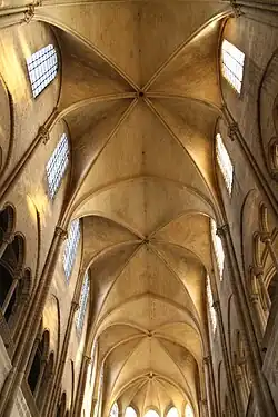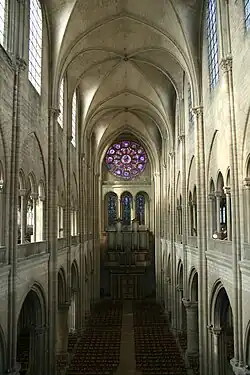 Das gotische Kirchenschiff ist eines der höchsten des 12. Jahrhunderts. Zu seiner Zeit wurde es nur von Notre-Dame de Paris um nur zwei Meter überragt. Die Höhe des Kirchenschiffs ist in drei im Wesentlichen gleich hohe Stockwerke unterteilt: die großen Arkaden im Erdgeschoss, die Arkaden der Emporen und schließlich die Obergadenfenster. Die Anordnung des Kirchenschiffs ist größtenteils auf seine drei sechsarmigen (sechsteiligen) Kreuzrippengewölbe zurückzuführen, die jeweils zwei Joche umfassen. Die Einführung dieser Art von Struktur hat eine offensichtliche Konsequenz: Die Pfeiler tragen nicht alle die gleiche Last, daher der Wechsel zwischen einfachen zylindrischen Schäften und von Säulchen flankierten Pfeilern, der auch in anderen großen Kirchen der Frühgotik zu finden ist (Laon, Paris, Sens, Lausanne und andere).
