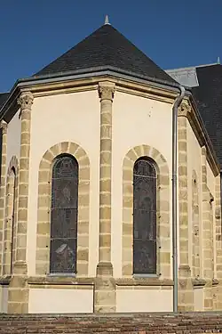 Das zentrale Chorfenster ist der Darstellung des Herzen Jesu gewidmet. Auf den seitlichen Fenstern sind die Verkündigung, die Geburt Christi, die Präsentation Jesu im Tempel und die Himmelfahrt Mariens dargestellt. Die kleinen unteren Szenen stellen den Tempelgang Mariens, die Anbetung der Hirten und die Herz-Jesu-Erscheinung der Nonne Margareta Maria Alacoque dar. Unter der Präsentation Jesu im Tempel sieht man einen Strauß weißer Lilien mit zwei Tauben und unter der Himmelfahrt Mariens ein leeres Grab, aus dem Blumen wachsen. Die beiden seitlichen Fenster tragen die Signatur des Glasmalers Louis-Victor Gesta.