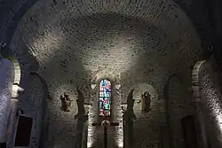 Die Kirche ist einschiffig und besitzt kein Querhaus. Ein Rundbogen öffnet das Langhaus zum Chor, der höher als das Langhaus und mit einem Tonnengewölbe gedeckt ist. An den Chor schließt sich eine halbkreisförmige Apsis an, die eine Halbkuppel überspannt. Die Apsiswand wird von sechs Rundbogenarkaden auf schmalen Säulen gegliedert. Der mittlere Bogen ging verloren, als man das Apsisfenster vergrößerte. Die Säulen sind mit Kapitellen ausgestattet, auf denen ein Vogel, Köpfe, zwei Engel mit ausgebreiteten Flügeln, Flechtwerk und stilisierte Akanthusblätter dargestellt sind. Diese archaisch anmutenden Kapitelle werden ins späte 11. oder frühe 12. Jahrhundert datiert und gehören zu den ältesten romanischen Skulpturen der Region.