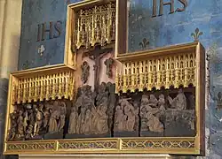 • In einer Seitenkapelle werden die Fragmente eines farbig gefassten und teilweise vergoldeten Schnitzaltars mit Szenen der Passion aufbewahrt. Der Altar wird in das frühe 16. Jahrhundert datiert und bestand ursprünglich aus sieben Szenen. In den 1960er und 1970er Jahren wurde er gestohlen. Vier Szenen, die Geißelung, der Judaskuss, die Kreuzabnahme und die Grablegung Christi, wurden wieder aufgefunden und zurückgebracht.[3]