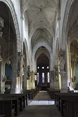 Das Langhaus ist dreischiffig und in vier Joche gegliedert. An die Seitenschiffe sind Kapellen angebaut. Hauptschiff und Seitenschiffe sind mit vierteiligen Kreuzrippengewölben gedeckt. Die östlichen Langhausjoche sind gotisch geprägt, das westliche Joch weist den Stil der frühen Renaissance auf.