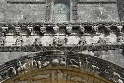 Die Wand des Obergeschosses der Fassade tritt deutlich zurück, bis etwa in die gleiche Tiefe, wie die innere Archivolte. Auf beiden Seiten des Obergeschosses befinden sich hinter den das Archivoltenfeld begrenzenden Halbsäulen strebepfeilerartige Wandstücke, im Grundriss um 45 Grad nach innen abgewinkelt. Der untere Teil des Obergeschosses ist eine Art Skulpturenfries, der oberseitig von einem stark ausladenden, profilierten und üppig pflanzlich dekorierten Kraggesims begrenzt wird. Das Gesims wird von zehn Kragsteinen getragen, die mit Porträts von Menschen und Tieren der realen und Fantasiewelt gestaltet sind, in höchster Qualität romanischer Steinmetzkunst. Die Zwischenräume der Kragsteinen sind mit rechteckigen Steinen ausgefüllt, die je ein eigenständiges pflanzliches Ornament tragen.