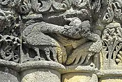 Das große Archivoltenportal besteht aus fünf Archivoltenbögen, die beidseitig auf neun halbrunden Diensten stehen. Je ein Archivoltenbogen wird auf jeder Seite von zwei Säulen getragen. Die äußeren Dienste sind dicker als die anderen. Die Kapitelle und die breiten Kämpferprofile sind überwiegend pflanzlich dekoriert. Lediglich die äußeren und inneren Kapitelle sind figural ornamentiert, teilweise mit Körpern von Vögeln, mit schlangenartigen Hälsen und menschlichen Gesichtern.