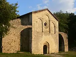 Die Westfassade der einschiffigen Kapelle besteht aus kleinformatigem Bruchstein und ist völlig schmucklos. Besonders bemerkenswert ist die Gliederung der Apsis. Ihre Bogenstellungen im unteren Teil ruhen auf starken Pfeilern, darüber stehen schlanke Säulen mit korinthischen Kapitellen.