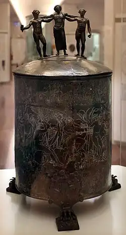 Der Stil der Friese ist nicht einheitlich, weshalb er zwei Handwerkern zugeschrieben wird. Der qualitativ bessere Hauptfries mit einer Szene aus der Argonautensage, die zugehörigen Ornamentbänder sowie die Attaschen auf den Cistenfüßen werden dabei Novios Plautios zugeschrieben, die gröberen, nachlässigeren Jagdszenen auf dem Deckel sowie die Deckelfiguren einem weiteren Handwerker. Ein Spiegel in Bologna[3] ist den Novios Plautios zugeschriebenen Friesen so ähnlich, dass auch er von ihm geschaffen worden sein könnte.