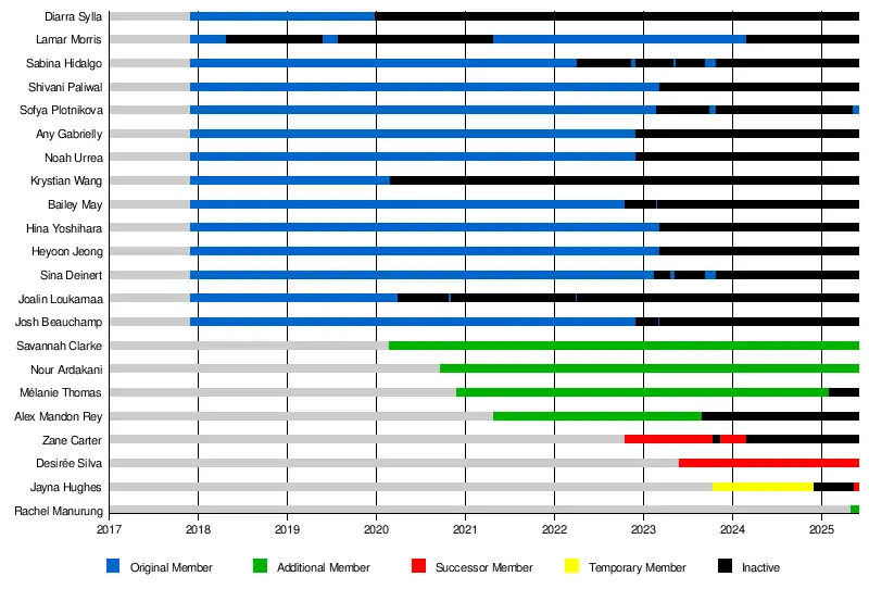 Am 4. Mai wurde Rachel Manurung offiziell als 19. Mitglied bekannt gegeben und vertritt Indonesien.[4] Am 18. Mai wurde Jayna, zunächst ein vorübergehendes Mitglied, offiziell als neue Vertreterin der Philippinen als Nachfolgerin von Bailey bekannt gegeben. Mit diesem Update nehmen zwei philippinische Mitglieder aus den Philippinen an der Reunion Tour teil.[5]