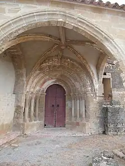 Die der Muttergottes geweihte Kirche ist ein spätromanischer Bau aus Werkstein. Vor das romanische Südportal mit Archivolten wurde eine gotische Vorhalle mit Gewölbe vorgelagert. Die Seitenkapellen der einschiffigen Kirche stammen ebenfalls aus späterer Zeit. Die Apsis ist im Inneren halbrund und außen polygonal. Unterhalb des Dachansatzes sind sehr viele skulptierte Kragsteine zu sehen. An der Westfassade befindet sich ein gotisches Portal und ein Glockengiebel (espadaña). In der Kirche wurden Reste der mittelalterlichen Wandmalereien mit der Darstellung der Apostel entdeckt.