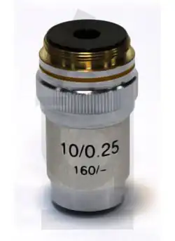 Bei Mikroskopen steigt die numerische Apertur häufig mit der Vergrößerungszahl des Objektivs. Die stark vergrößernden Objektive (meist 60x, 63x oder 100x, aber auch bei hochauflösenden Varianten von 20x und 40x-Objektiven) brauchen dementsprechend Immersionsflüssigkeit zwischen Objektiv und Präparat (Deckglas). Bei einem Öffnungswinkel von 140° ergibt sich für ein Trockenobjektiv eine numerische Apertur von 0,94, für Wasserimmersionsobjektive eine von 1,25 und für Ölimmersionsobjektive gar eine von 1,43.[2] Entsprechend höher ist die Lichtstärke und das Auflösungsvermögen der Immersionsobjektive.