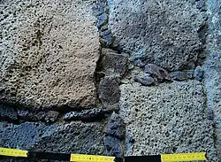 - sogenannte zyklopische Bauweise. Untere Reihensteine weisen Größen von 1,13 × 0,68 m (= 0,77 m²); die oberen Reihensteine 0,74 × 0,38 m auf (0,28 m²). Die Steine sind erkennbar in eine großklotzige, grobe Bauweise im unteren Abschnitt (12 Schichten) und eine feinsteinige Bauweise im oberen Abschnitt (17 Schichten erhalten) unterteilt. Dabei ist bei beiden Bauabschnitten zu sehen, dass nach oben hin kleinere Steine verwendet wurden.