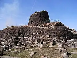 - Kegelstumpfförmig; dunkelviolette/schwarze Oberfläche. Einige gefundene helle Mergelsteine können auf eine effektvolle weiße Bekrönung hinweisen. Es wurden auch Kragsteine im Schutt gefunden, die die Spitze des Hauptturms analog zu anderen Funden bei verschiedenen Nuraghen (Nuraghe Costa Palma) mit einer Brustwehr bildeten.