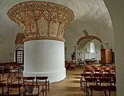 Auf dem Mittelpfeiler befinden sich gut erhaltene Wandmalereien, sie stellen in 13 Feldern die Passionsgeschichte dar und stammen von ca. 1300.