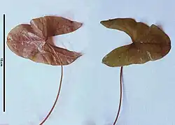Die Schwimmblätter haben vier oder fünf Hauptadern. Die Blattoberfläche ist kahl und weist unregelmäßig verteilte violette Flecken auf.[3] Die Färbung des Blattes variiert mit der Lichtintensität, der es ausgesetzt ist. Bei direkter Sonneneinstrahlung färben sich die Blätter rot aufgrund von Anthocyanen. Diese schützen das Gewebe vor dem Sonnenlicht.[4][5]