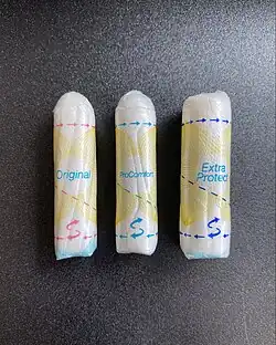 o.b. Original: Diese Variante verfügt über geschwungene Rillen, die die Flüssigkeit ins Innere des Tampons leiten und StayDry Technologie, die das Rückholbändchen trocken hält.[9]