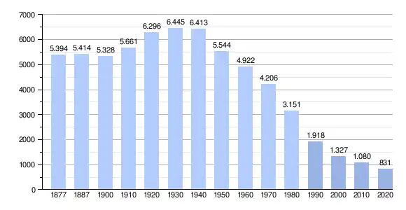 Nach einem Anwachsen der Gemeindegröße auf über 5500 Einwohner um 1940 sank die Zahl der Bevölkerung in der Folgezeit stetig bis nun unter 1000.