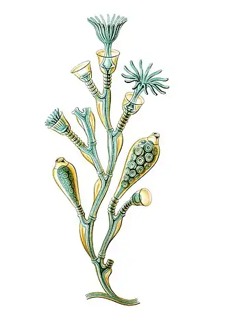 Obelia ist eine Gattung der Nesseltiere. Derzeit sind über 20 Arten dieser Gattung bekannt. Die Polypen bilden Kolonien, in denen die Einzeltiere durch Ausläufer miteinander in Verbindung stehen. Die Stockbildung erfolgt entweder sympodial, zum Beispiel bei Obelia geniculata, oder stolonial. Ein Einzelpolyp ist dabei nicht größer als 1 mm und wird von durchscheinendem Periderm umgeben. Der Polyp ist rund und flaschenförmig, dessen Körper sich leicht vom viel dünneren Stiel (Hydrocaulus) unterscheiden lässt. Am geringelten Stiel befindet sich das Diaphragma. Die Hydranthen sind von einer offenen kelchförmigen Hülle umgeben, einer formstabilen Hydrotheca mit gezähntem Rand, in die sich der Körper vollständig zurückziehen kann. Die Tentakel des Polypen sind in einem Kranz um die Mundöffnung (Hypostom) am oberen Teil angeordnet und werden gleichzeitig gebildet.