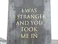 Das Zitat stammt aus der sogenannten „Weltgerichtsrede“ (Mt 25,31-46), dem Schluss der großen eschatologischen Rede, die Jesus Christus dem Matthäus-Evangelium zufolge auf dem Ölberg bei Jerusalem gehalten hat. Der Schlüssel zum Verständnis des Satzes ist die nachfolgende Feststellung aus dem Munde Jesu: „Was ihr für einen meiner geringsten Schwestern und Brüder getan habt, das habt ihr mir getan“ (Mt 25,40).[3] Oguibe möchte mit dem Bibelzitat insbesondere die evangelikalen Christen der Vereinigten Staaten, die sich energisch gegen die Aufnahme von Flüchtlingen wehren, auffordern, die Grenzen vor Flüchtlingen nicht zu schließen. Für ihn sei dies eine universelle humanitäre Botschaft.[4]