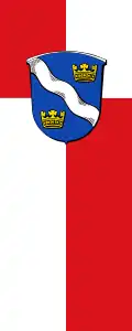 „Auf das in Rot und Weiß geständerte Flaggentuch im Kreuzpunkt aufgelegt das Gemeindewappen.“[17]