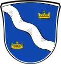 Blasonierung: „In blauem Schild ein silbernes, schrägrechts liegendes Wellenband, links oben und rechts unten je eine Krone.“[16] |