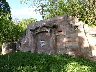 Von der Seite nach Laufamholz zu sieht es wie eine kleine Burg aus; die Bauherrn hatten es mit Mauer und Wassergraben und zwei kleinen flankierenden Türmen am Eingang versehen. Das Schloss wurde 1943 bei einem Luftangriff zerstört, es bietet heute einen vernachlässigten und vom Vandalismus geprägten Anblick.[6]
