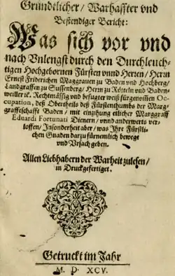 - Grundtlicher Warhaffter und Bestendiger Bericht: Was sich vor und nach Unlangst durch den Herrn Ernest Friderichen Maggraven zu Baden ... fürgenommen Occupation, deß Obertheils deß Fürstenthumbs der Marggraffeschafft Baden mit einzihung etlicher Marggraff Eduardi Fortunati Dienern ... verloffen u.s.w.,1595