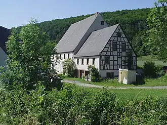 Das ehemalige Mühlhaus, ein zweigeschossiger Satteldachbau mit einem Anbau gleicher Bauart mit geringerer Firsthöhe, ist mit 1833 bezeichnet. Ein Nebengebäude, ein erdgeschossiger Satteldachbau, ist mit 1788 bezeichnet. Die Gebäude gelten als Denkmal.[12]