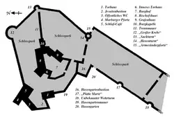 In der Zeit des Nationalsozialismus wurden am südlichen Teil des Schlossparks zwei Hochbunker für den zivilen Luftschutz errichtet, die teilweise in die historischen Befestigungsanlagen integriert wurden. Ein dritter Luftschutzbunker mit zwei einzelnen Bauten entstand auf dem Gelände der Burgfreiheit an der Nordseite der Burgstraße. Zu Tarnungszwecken wurde das äußere Erscheinungsbild der Gebäude teilweise an die Architektur des Oberen Schlosses angelehnt. Zusammengenommen hatten die Bunkeranlagen eine Platzkapazität von Sitz- und Liegeplätzen für etwa 3000 Personen.[13] Nach dem Ende des Zweiten Weltkriegs wurden bei zweien der Bunker die Obergeschosse in privaten Wohnraum umgewandelt, der bis in die Gegenwart benutzt wird.