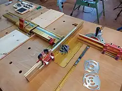 Frästisch mit verschiedenen Anschlägen und der Höheneinstellung von oben