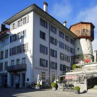 Nach dem Abriss des mächtigen Obertores erhielt das grosse Haus 1876 eine neue Fassadierung zur Obergasse hin. Der Ladeneinbau erfolgte etwas später. Der Turm blieb in Privatbesitz und erhielt 2000/2001 Fenster im Turmaufsatz.[1][2]