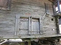 Der mehrstöckige Oberbau hat eine Türe (manchmal bis vier, beziehungsweise eine Türe pro Eigentümer) zur Tenne (Stadelgang) und gehört mehreren Eigentümern. Die Stockwerke sind entsprechend mit Sparren und Läden unterteilt. Im obersten Stockwerk werden die Hülsenfrüchte gelagert. In der weniger arbeitsintensiven Winterzeit wurden auf der Tenne die Garben gedroschen, bevor man sie auf den Stockwerken lagerte. Die Tenne (Te) und die beidseitigen Räume (Techäste) haben einen Boden aus vernuteten Tannenhölzern (12 × 12 × 6 cm), damit das Getreide nicht durchsickert. Die Wände der Tenne bestehen aus 6 cm dicken und 70 cm hohen Laden, deren Ende in einem Pfosten (Stud) vernutet sind. Die Stockwerke bestehen aus rohen Latten mit Zwischenräumen zur Durchlüftung der Garben. Dem gleichen Zweck dienen auch die zwei kleinen Fenster mit Fliegengittern zuoberst am Stadel.