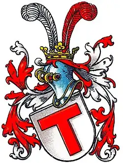 Blasonierung: In Silber ein rotes Antoniuskreuz. Auf dem gekrönten Helm mit rot-silbernen Helmdecken eine silberne und eines rote Straußenfeder.[1]