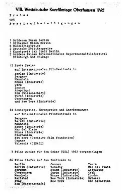 Deutsche Kurzfilme von jungen Autoren, Regisseuren und Produzenten erhielten in den letzten Jahren eine große Zahl von Preisen auf internationalen Festivals und fanden Anerkennung der internationalen Kritik. Diese Arbeiten und ihre Erfolge zeigen, daß die Zukunft des deutschen Films bei denen liegt, die bewiesen haben, daß sie eine neue Sprache des Films sprechen.