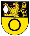 Blasonierung: „Von Schwarz und Gold geteilt, oben ein wachsender rotbewehrter und -bezungter goldener Löwe, eine silberne Raute haltend, unten ein schwarzer Ring.“ |