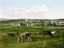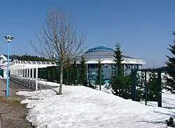 Blick vom Schneekopf (978 m) auf Oberhof. Aus dieser Perspektive erkennt man sehr gut die Lage der Stadt Oberhof auf dem Hauptkamm des Thüringer Waldes in etwa 800 m Höhe.
