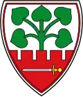 Blasonierung: „Geteilt durch Zinnenschnitt in Silber (Weiß), darin eine fünfblättrige stilisierte wachsende grüne Linde und Rot, darin ein liegendes silbernes (weißes) Schwert mit goldenem (gelbem) Griff.“ |