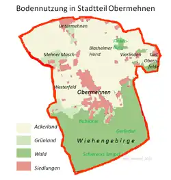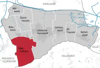 Obermehnen ist ein Ort in Nordrhein-Westfalen im Kreis Minden-Lübbecke. Das Dorf gehört administrativ zur Stadt Lübbecke und hat gemäß der Hauptsatzung der Stadt den Status einer Ortschaft. Obermehnen hat 1256 Einwohner und ist rund 9,6 km² groß. Mit rund 131 Einwohnern pro km² hat Obermehnen die niedrigste Einwohnerdichte aller Lübbecker Stadtteile, u. a. auch deshalb, weil rund 4,3 km², also 45 Prozent,[2] des Gebietes aus dem unbewohnten Bergwald des Wiehengebirges bestehen. Obermehnen ist damit der relativ waldreichste Stadtteil Lübbeckes.