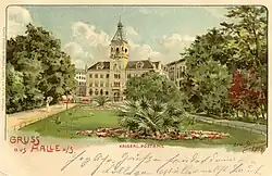 Zudem hatte die Bahnpost immer mehr an Bedeutung gewonnen und so gab es zunächst ein Königliches Post-Speditions-Amt Nr. 6 in der Leipziger Straße und eine Bahnhofs-Abfertigungs-Expedition am Bahnhof der Thüringischen Eisenbahn-Gesellschaft.[7] Mitte der 1870er Jahre kam ein Kaiserliches Postamt II am Bahnhof hinzu, das aber nicht dem Postamt I, sondern ebenfalls der Oberpostdirektion unterstellt war. Das Stadt-Postamt blieb als Kaiserliches Postamt I weiter im gemeinsamen Gebäude mit der Kaiserlichen Oberpostdirektion in der Großen Steinstraße, das in den 1870er Jahren entstandene Kaiserliche Bahn-Postamt Nr. 29 wurde hingegen zunächst im Obergeschoss des Telegrafenamtes untergebracht, und mit der Entstehung des Deutschen Reiches wurde auch die Telegrafie der Reichspost zugeordnet, so dass diese auch die bestehenden Gebäude übertragen bekam.[6][8] Bis 1890 kamen weitere Kaiserliche Postämter in Halle hinzu (Nr. 3: Moritzzwinger, Nr. 4: Geiststraße), aber es änderte sich nichts an der Verteilung der zuvor gegründeten Ämter.[9]