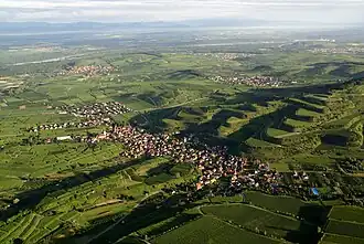 Luftbildaufnahme von Oberrotweil – im Hintergrund der Rhein und die Vogesen