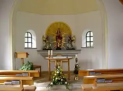 Die Kirche ist ein schlichter Rechteckbau mit einem überdachten Portikus, einer runden Apsis und einem als Glockenturm genutzten Dachreiter. Seit 1960 befindet sich dort eine umgegossene Glocke (die ursprüngliche Wetterglocke stammte von 1439), damals wurde auch ein elektrisches Geläut eingebaut. Die Holzdecke stammt aus dem Jahr 1930, ein neues Gestühl wurde 1978 eingerichtet. Auf dem Marienaltar steht eine spätgotische Holzstatue der Madonna mit dem Kind aus dem Jahr 1480. Über dem Eingang hängt ein großes hölzernes Kruzifix. Die Kreuzwegbilder und der wuchtige Opferstock wurden neu angeschafft.[13][14]