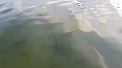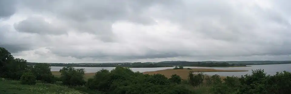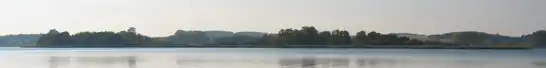 | Blick vom Westufer, im Hintergrund das Dorf Warnitz | ||