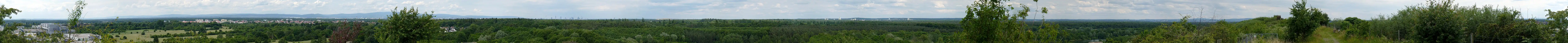 Von links nach rechts: Blick Richtung Westen mit Gewerbegebiet Mörfelden-Walldorf im Vordergrund; Blick auf den Ortsteil Walldorf; Frankfurter Flughafen mit Taunus-Gipfeln im Hintergrund; Skyline von Frankfurt am Main (Europaturm, Messeturm, Main Tower, Commerzbank Tower, Baustelle des Neubaus der Europäischen Zentralbank, Henninger-Turm); Solarpark auf der ehemaligen Hausmülldeponie in Dreieich-Buchschlag; Blick auf Langen; Egelsbach (im Vordergrund A5 und Oberwaldsee); Erzhausen (im Hintergrund der nördliche Odenwald); Plateau des Oberwaldbergs