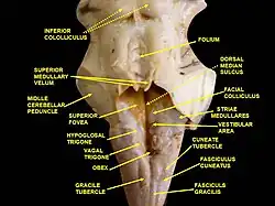 Im Bereich des Obex liegt die Area postrema.[2] Darüber hinaus kreuzen hier über die inneren Bogenfasern (Fibrae arcuatae internae) auch die Bahnen des lemniskalen Systems auf die gegenüberliegende (kontralaterale) Seite. Damit ist der Obex also eine schmale Querverbindung am unteren Ende des Daches des vierten Ventrikels.[3]