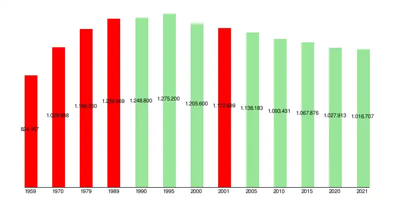 - rot: Volkszählungen in der Sowjetunion (bis 1989) und der Ukraine (2001); grün: Schätzungen des Ukrainischen Statistisches Amtes; Stichtag: jeweils 1. Januar[16]