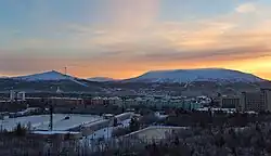 Die Stadt Montschegorsk im Winter mit dem Bandystadion im Vordergrund
