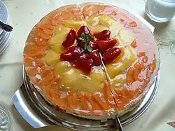 Eine weitere Möglichkeit ist die Verwendung von Früchten, Fruchtmus oder Obststücken, die in Sahnetorten oder Cremetorten eingearbeitet sind. Im Allgemeinen spricht man dann von Frucht-Sahne-Torte oder Frucht-Creme-Torte. Eine beliebte Variante ist die Quark-Sahne-Torte (auch Käse-Sahne-Torte), die mit Früchten, beispielsweise Erdbeeren, Himbeeren, Johannisbeeren oder Pfirsichstücken verfeinert werden kann.[1][2]