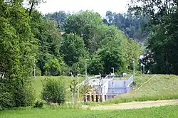 • Durchfließt zu Füßen der Ochsenbachsiedlung von Wiesloch am linken Hang das Hochwasserrückhaltebecken Ochsenbachtal. Hinter dem im Jahr 2020 errichteten, 4,4 km hohen Erddamm können bis zu 37.000 m³ Hochwasser zurückgehalten werden, die dann gesteuert wieder abfließen. Das vom Abwasser- und Hochwasserschutzverband Wiesloch betriebene Becken liegt gewöhnlich trocken.[LUBW 8]